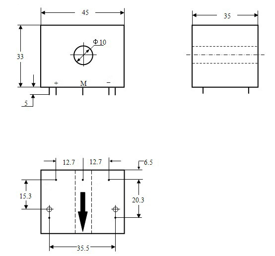 安裝:用5根Ф0.6mm硬銅線安裝在線路闆上(shàng)或用兩個(gè)Ф3自攻釘緊固。